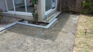 Como paso previo para la creación de la nueva zona de tránsito peatonal se procedió al acondicionamiento del terreno, al replanteo del recorrido de las canaletas de drenaje necesarias, y a la creación de una nueva solera base de hormigón en masa para el posterior apoyo del pavimento.