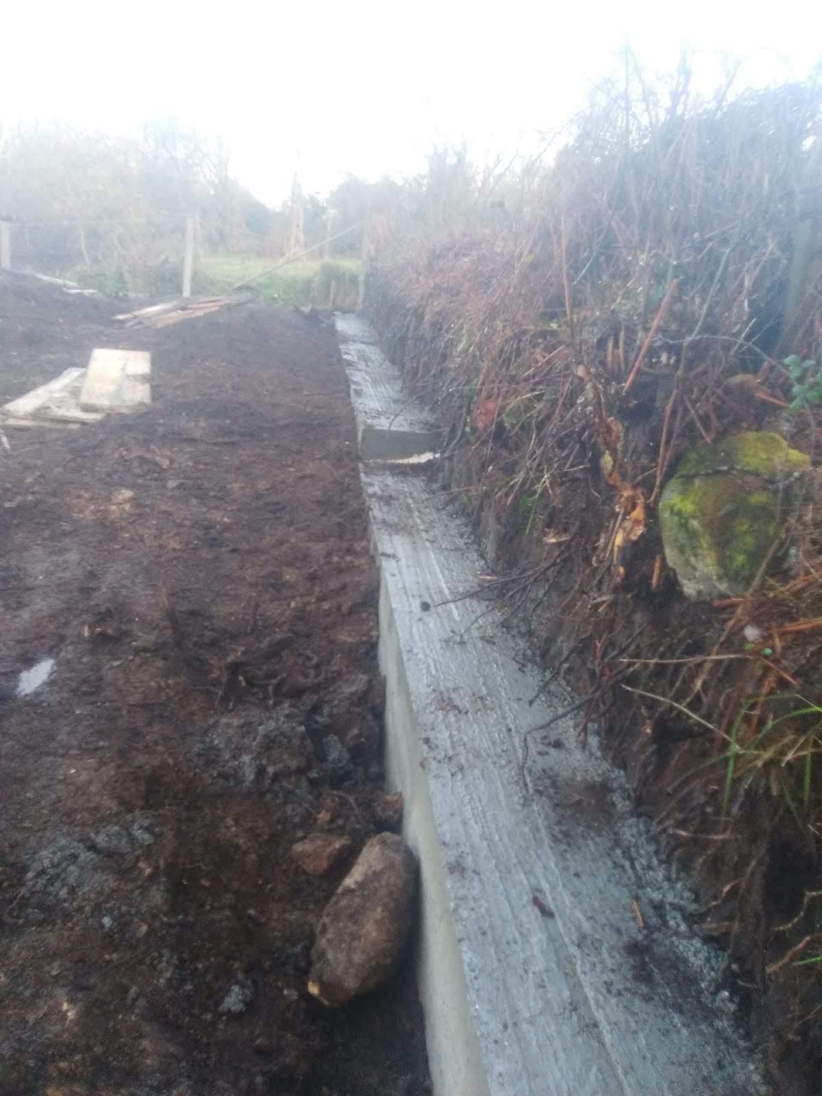 Se dio comienzo a los trabajos de construcción propiamente dichos con los cierres laterales de bloques de hormigón prefabricados. Para ello se hincaron previamente en el terreno postes de hormigón pretensado, para seguidamente realizar el encofrado necesario para la zapata longitudinal de cimentación, así como proceder al hormigonado de la misma.